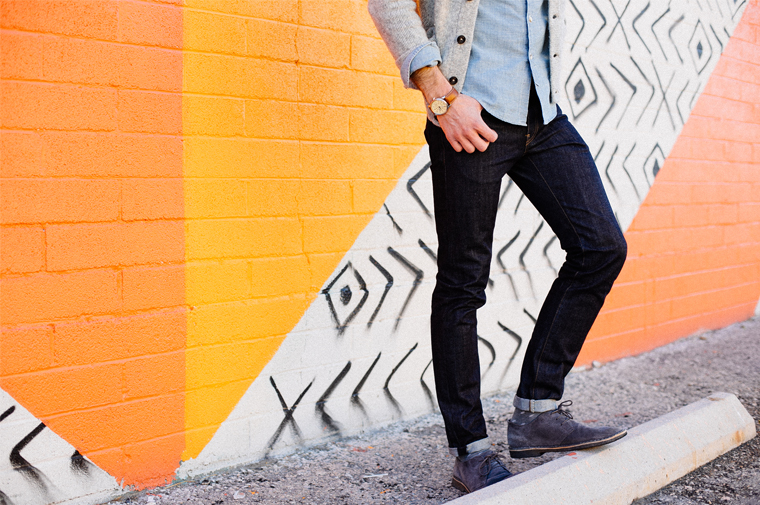 With just one day and night in Sin City, I was keen to wear an outfit that I could easily transition from day to night. I opted for selvedge denim, grey suede chukkas, a light grey woolen cardigan and a classic chambray button down. A leather watch and belt with a brass bracelet rounded out the look for my color hunting and gig adventures.